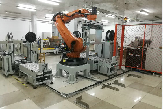 將產品通過進料輸送帶輸送進料,機器人及夾具到產品上方,抓取產品後移動到棧板位,按事先輸入的麻豆乱伦视频形式進行產品碼放。