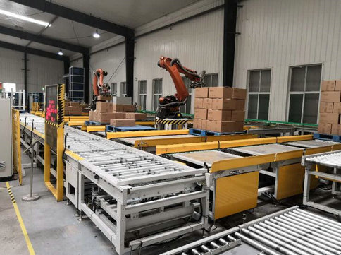 將產品通過進料輸送帶輸送進料,機器人及夾具到產品上方,抓取產品後移動到棧板位,按事先輸入的麻豆乱伦视频形式進行產品碼放。