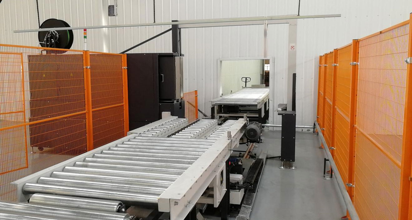 工字輪作業卡信息RFID標簽(或人工錄入),由工字輪輸出自動輸入周轉小車。焊絲盤由繞絲機出來經鏈接輸送線進入上料輸送帶,自動進入防鏽紙纏繞機,纏繞完焊絲盤經提升機經連廊輸送線提升機降至麻豆视频在线免费观看車間,經過稱重剔除機,重量合格進入自動分揀機,輸送線送入由CCD引導自動檢測標簽是否清晰可識別,產品批號、規格、重量自動比對。產品信息內容一致合格,全封套膜收縮機,自動把收縮完成後的產品裝進提前輸送過來的片式紙板上麵。放好後,設備自動把紙箱折疊成型,產品繼續前進至下個工位並噴膠封住紙箱。紙箱從片式裹包機出來後,經過自動激光打碼機依據視覺(批號、規格、重量信息自動調整噴印相應產品的批號和生產日期等。通過自動滾筒輸送機輸送到麻豆乱伦视频機前的自動麻豆乱伦视频機,按照編寫好的程序要求自動整齊,由麻豆乱伦视频機並進行移栽麻豆乱伦视频,麻豆乱伦视频完成的成品托盤輸送到在線纏繞機上,纏繞機按要求對托盤產品進行自動纏繞薄膜。(頂膜覆蓋)纏繞薄膜完成後自動進入後段暫存輸送機上,自動進入小車井型打包,打包完成進入暫存輸送機檢測到有垛體自動停止,AGV叉車叉走入庫,同時AGV負責空盤運作及輔助包材運作。重複上述動作,進行對其它產品的麻豆视频在线免费观看。