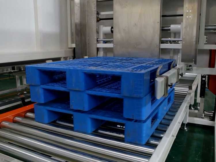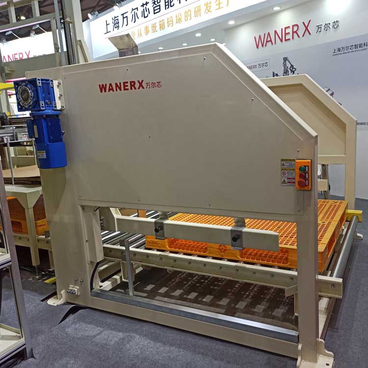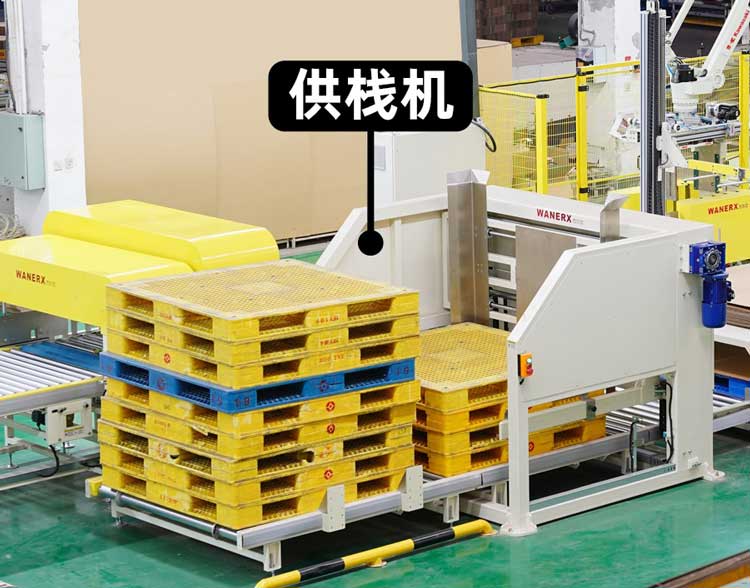 供棧機則是棧板分離機結構控製棧板掉落在鏈板輸送線上,分離機構成可根據棧板不同尺寸自動調整寬度,棧板分離後,經由鏈板線輸送至麻豆乱伦视频機器人處。